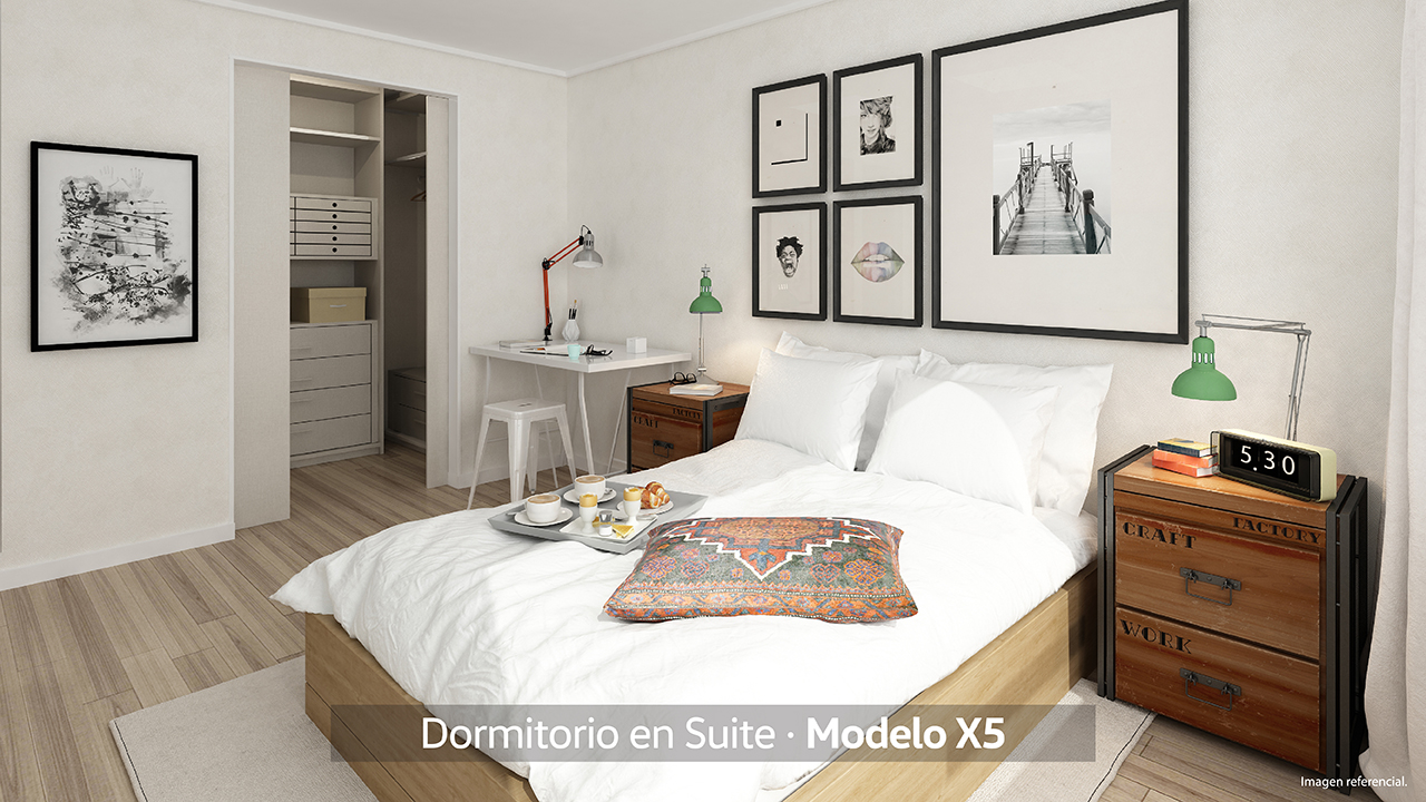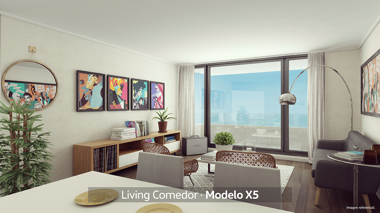 Cocina americana amoblada y equipada con: encimera, horno eléctrico y campana. Cubiertas de cuarzo blanco.